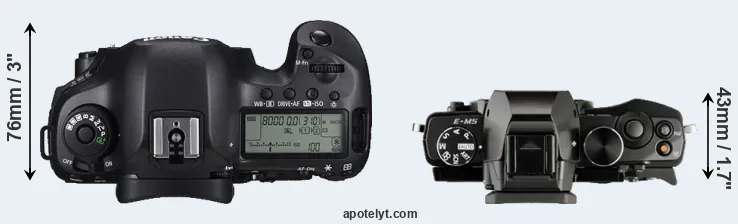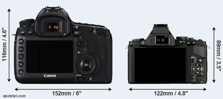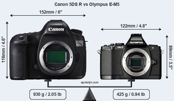 The side-by-side display below illustrates the physical size and weight of the Canon 5DS R and the Olympus E-M5. The two cameras are presented according to their relative size. Three consecutive perspectives from the front, the top, and the back are available. All width, height and depth measures are rounded to the nearest millimeter.
