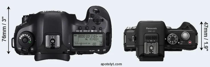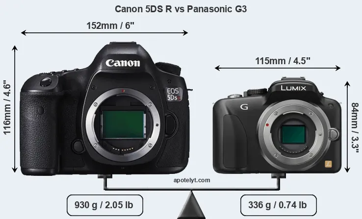 The side-by-side display below illustrates the physical size and weight of the Canon 5DS R and the Panasonic G3. The two cameras are presented according to their relative size. Three successive views from the front, the top, and the rear are shown. All width, height and depth measures are rounded to the nearest millimeter.