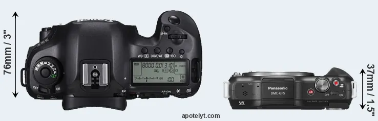 The physical size and weight of the Canon 5DS R and the Panasonic GF5 are illustrated in the side-by-side display below. The two cameras are presented according to their relative size. Three consecutive perspectives from the front, the top, and the back are available. All size dimensions are rounded to the nearest millimeter.