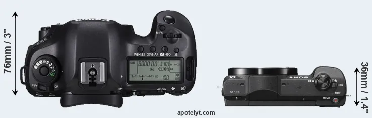 The side-by-side display below illustrates the physical size and weight of the Canon 5DS R and the Sony A5100. The two cameras are presented according to their relative size. Three successive views from the front, the top, and the rear are shown. All width, height and depth dimensions are rounded to the nearest millimeter.