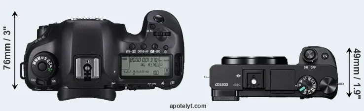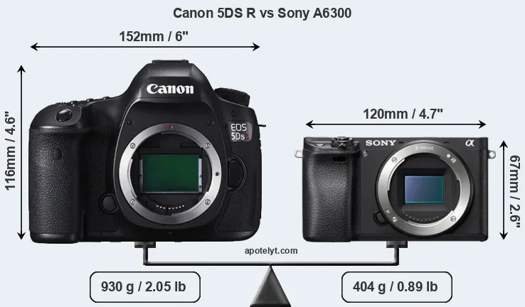 An illustration of the physical size and weight of the Canon 5DS R and the Sony A6300 is provided in the side-by-side display below. The two cameras are presented according to their relative size. Three consecutive perspectives from the front, the top, and the back are available. All size dimensions are rounded to the nearest millimeter.