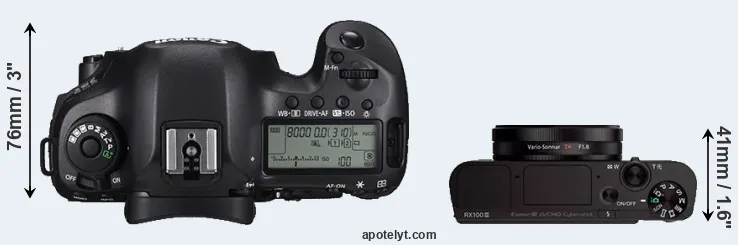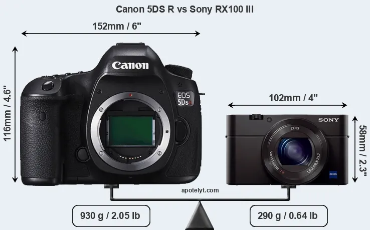 The side-by-side display below illustrates the physical size and weight of the Canon 5DS R and the Sony RX100 III. The two cameras are presented according to their relative size. Three successive views from the front, the top, and the rear are shown. All width, height and depth dimensions are rounded to the nearest millimeter.
