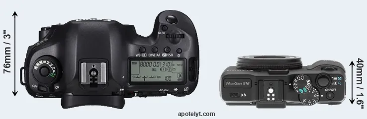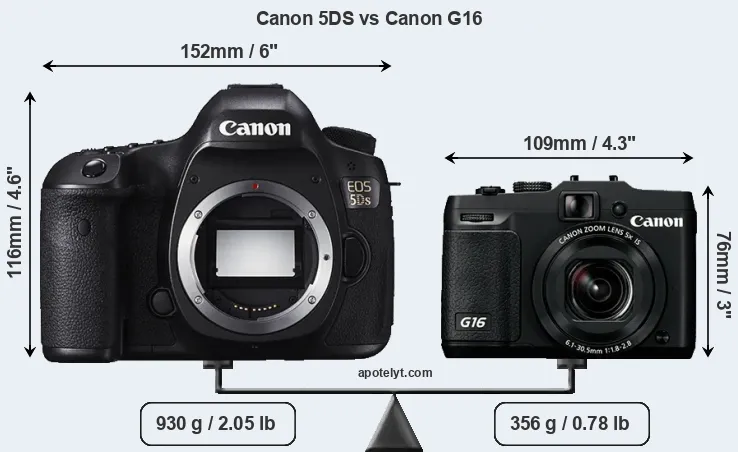 The physical size and weight of the Canon 5DS and the Canon G16 are illustrated in the side-by-side display below. The two cameras are presented according to their relative size. Three consecutive perspectives from the front, the top, and the back are available. All size dimensions are rounded to the nearest millimeter.