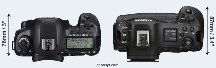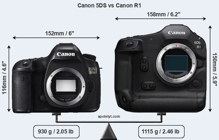 The physical size and weight of the Canon 5DS and the Canon R1 are illustrated in the side-by-side display below. The two cameras are presented according to their relative size. Three consecutive perspectives from the front, the top, and the back are available. All width, height and depth dimensions are rounded to the nearest millimeter.
