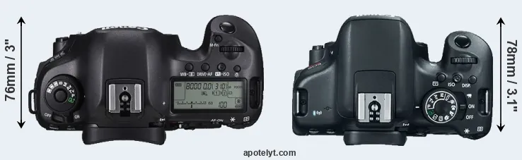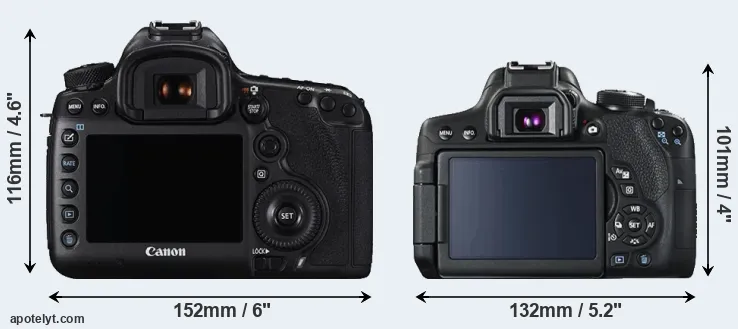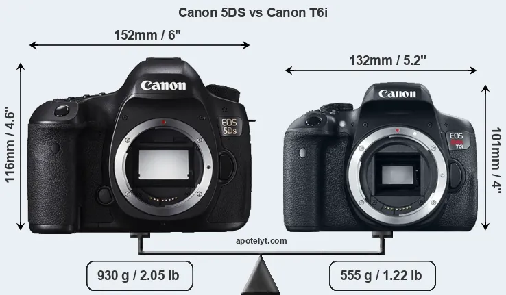 The physical size and weight of the Canon 5DS and the Canon T6i are illustrated in the side-by-side display below. The two cameras are presented according to their relative size. Three consecutive perspectives from the front, the top, and the back are available. All size dimensions are rounded to the nearest millimeter.