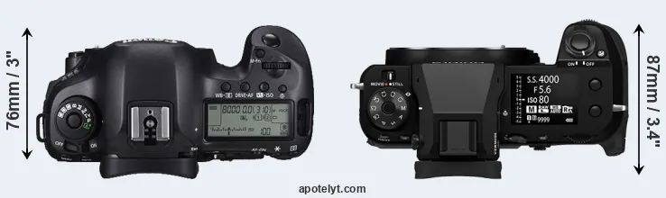 The side-by-side display below illustrates the physical size and weight of the Canon 5DS and the Fujifilm GFX 100S II. The two cameras are presented according to their relative size. Three consecutive perspectives from the front, the top, and the back are available. All size dimensions are rounded to the nearest millimeter.