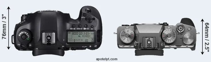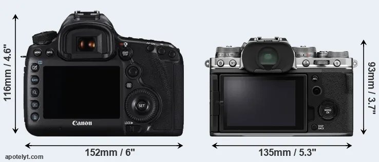 The side-by-side display below illustrates the physical size and weight of the Canon 5DS and the Fujifilm X-T4. The two cameras are presented according to their relative size. Three successive views from the front, the top, and the rear are shown. All width, height and depth measures are rounded to the nearest millimeter.