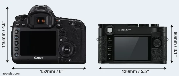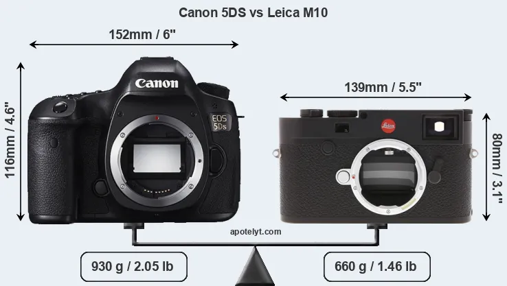 The side-by-side display below illustrates the physical size and weight of the Canon 5DS and the Leica M10. The two cameras are presented according to their relative size. Three consecutive perspectives from the front, the top, and the back are available. All size dimensions are rounded to the nearest millimeter.