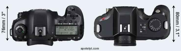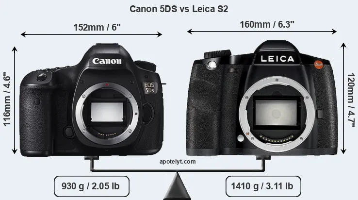 The side-by-side display below illustrates the physical size and weight of the Canon 5DS and the Leica S2. The two cameras are presented according to their relative size. Three consecutive views from the front, the top, and the rear side are shown. All width, height and depth measures are rounded to the nearest millimeter.