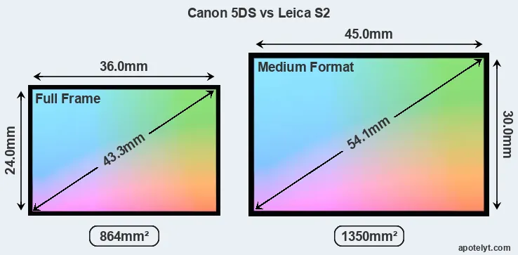 Of the two cameras under consideration, the Canon 5DS features a full frame sensor and the Leica S2 a medium format sensor. The sensor area in the S2 is 56 percent bigger. As a result of these sensor size differences, the cameras have a format factor of, respectively, 1.0 and 0.8. Both cameras have a native aspect ratio (sensor width to sensor height) of 3:2.