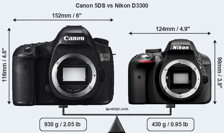 An illustration of the physical size and weight of the Canon 5DS and the Nikon D3300 is provided in the side-by-side display below. The two cameras are presented according to their relative size. Three consecutive views from the front, the top, and the rear side are shown. All width, height and depth measures are rounded to the nearest millimeter.