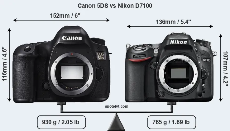 An illustration of the physical size and weight of the Canon 5DS and the Nikon D7100 is provided in the side-by-side display below. The two cameras are presented according to their relative size. Three successive views from the front, the top, and the rear are shown. All width, height and depth measures are rounded to the nearest millimeter.
