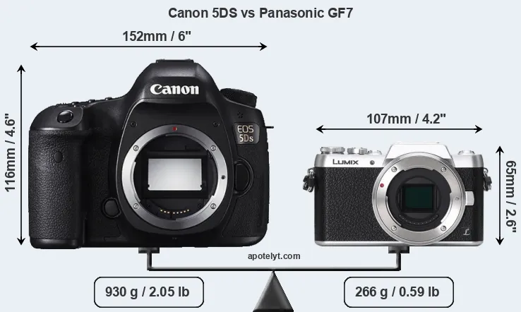 The side-by-side display below illustrates the physical size and weight of the Canon 5DS and the Panasonic GF7. The two cameras are presented according to their relative size. Three successive views from the front, the top, and the rear are shown. All width, height and depth measures are rounded to the nearest millimeter.