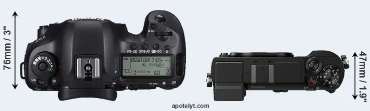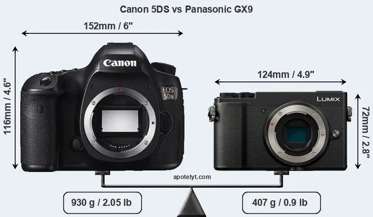 The physical size and weight of the Canon 5DS and the Panasonic GX9 are illustrated in the side-by-side display below. The two cameras are presented according to their relative size. Three successive views from the front, the top, and the rear are shown. All width, height and depth dimensions are rounded to the nearest millimeter.