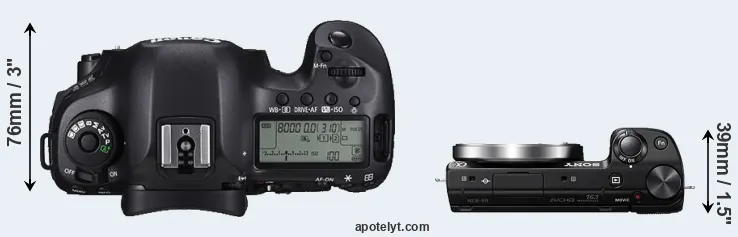 An illustration of the physical size and weight of the Canon 5DS and the Sony NEX-5R is provided in the side-by-side display below. The two cameras are presented according to their relative size. Three consecutive perspectives from the front, the top, and the back are available. All width, height and depth measures are rounded to the nearest millimeter.
