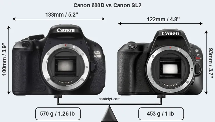 The side-by-side display below illustrates the physical size and weight of the Canon 600D and the Canon SL2. The two cameras are presented according to their relative size. Three successive views from the front, the top, and the rear are shown. All width, height and depth measures are rounded to the nearest millimeter.