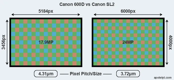 While the two cameras under review share the same sensor size, the SL2 offers a higher resolution of 24 megapixels, compared with 17.9 MP of the 600D. This megapixels advantage translates into a 16 percent gain in linear resolution. On the other hand, these sensor specs imply that the SL2 has a higher pixel density and a smaller size of the individual pixel (with a pixel pitch of 3.72μm versus 4.31μm for the 600D). However, it should be noted that the SL2 is much more recent (by 6 years and 4 months) than the 600D, and its sensor will have benefitted from technological advances during this time that compensate for the smaller pixel size.