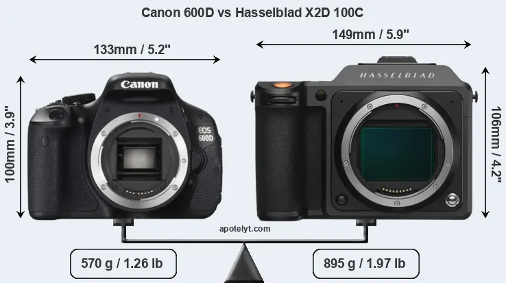 The side-by-side display below illustrates the physical size and weight of the Canon 600D and the Hasselblad X2D 100C. The two cameras are presented according to their relative size. Three consecutive perspectives from the front, the top, and the back are available. All size dimensions are rounded to the nearest millimeter.