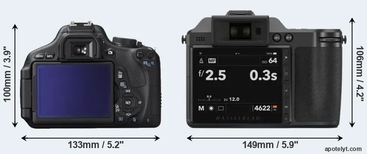 Going beyond this snapshot of core features and characteristics, what are the differences between the Canon EOS 600D and the Hasselblad X2D 100C? Which one should you buy? Read on to find out how these two cameras compare with respect to their body size, their imaging sensors, their shooting features, their input-output connections, and their reception by expert reviewers.