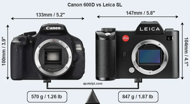 If the front view area (width x height) of the cameras is taken as an aggregate measure of their size, the Leica SL is notably larger (15 percent) than the Canon 600D. Moreover, the Leica SL is substantially heavier (49 percent) than the 600D. It is noteworthy in this context that the Leica SL is splash and dust-proof, while the 600D does not feature any corresponding weather-sealing.