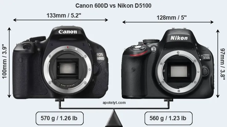 The side-by-side display below illustrates the physical size and weight of the Canon 600D and the Nikon D5100. The two cameras are presented according to their relative size. Three successive views from the front, the top, and the rear are shown. All width, height and depth dimensions are rounded to the nearest millimeter.