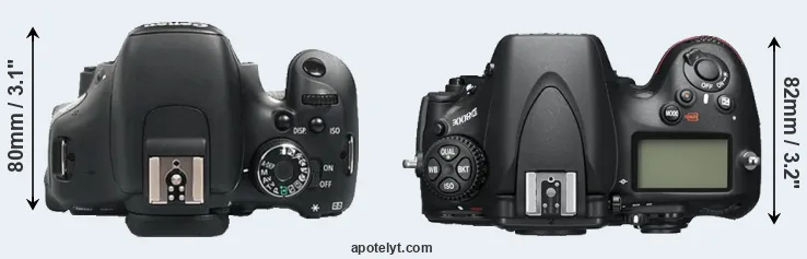 An illustration of the physical size and weight of the Canon 600D and the Nikon D800E is provided in the side-by-side display below. The two cameras are presented according to their relative size. Three consecutive perspectives from the front, the top, and the back are available. All size dimensions are rounded to the nearest millimeter.