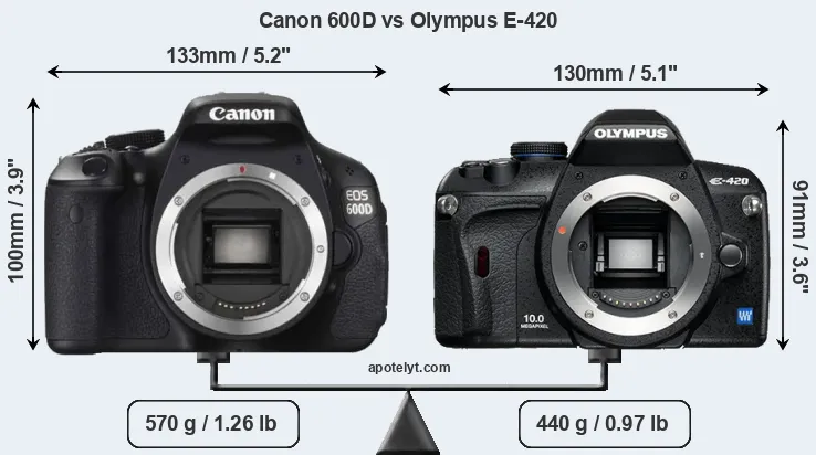 The side-by-side display below illustrates the physical size and weight of the Canon 600D and the Olympus E-420. The two cameras are presented according to their relative size. Three consecutive perspectives from the front, the top, and the back are available. All width, height and depth measures are rounded to the nearest millimeter.