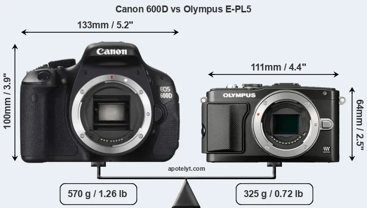 If the front view area (width x height) of the cameras is taken as an aggregate measure of their size, the Olympus E-PL5 is considerably smaller (47 percent) than the Canon 600D. Moreover, the E-PL5 is substantially lighter (43 percent) than the 600D. In this context, it is worth noting that neither the 600D nor the E-PL5 are weather-sealed.