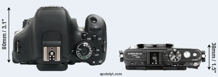 An illustration of the physical size and weight of the Canon 600D and the Olympus E-PL5 is provided in the side-by-side display below. The two cameras are presented according to their relative size. Three consecutive views from the front, the top, and the rear side are shown. All size dimensions are rounded to the nearest millimeter.