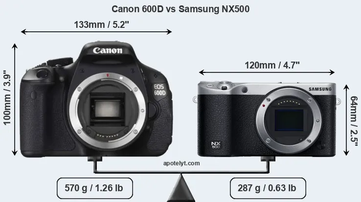 If the front view area (width x height) of the cameras is taken as an aggregate measure of their size, the Samsung NX500 is considerably smaller (42 percent) than the Canon 600D. Moreover, the NX500 is substantially lighter (50 percent) than the 600D. In this context, it is worth noting that neither the 600D nor the NX500 are weather-sealed.