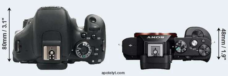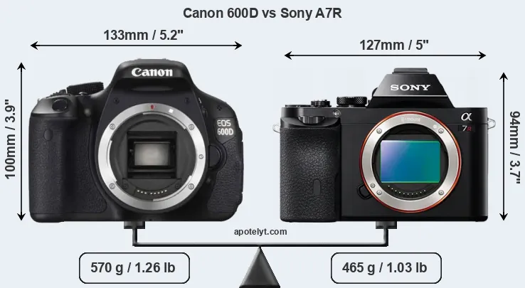 The physical size and weight of the Canon 600D and the Sony A7R are illustrated in the side-by-side display below. The two cameras are presented according to their relative size. Three successive views from the front, the top, and the rear are shown. All size dimensions are rounded to the nearest millimeter.