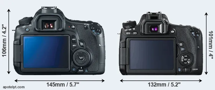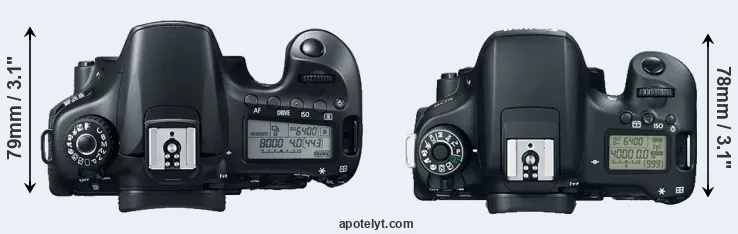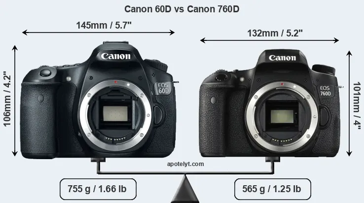 The physical size and weight of the Canon 60D and the Canon 760D are illustrated in the side-by-side display below. The two cameras are presented according to their relative size. Three consecutive perspectives from the front, the top, and the back are available. All width, height and depth measures are rounded to the nearest millimeter.