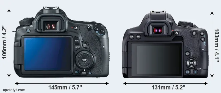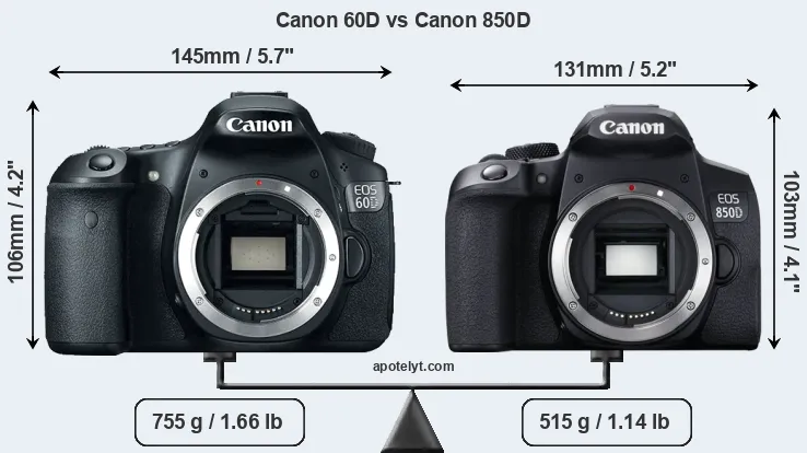 The physical size and weight of the Canon 60D and the Canon 850D are illustrated in the side-by-side display below. The two cameras are presented according to their relative size. Three consecutive perspectives from the front, the top, and the back are available. All width, height and depth measures are rounded to the nearest millimeter.