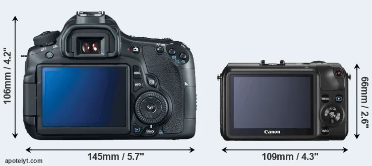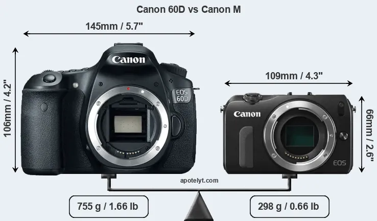 The physical size and weight of the Canon 60D and the Canon M are illustrated in the side-by-side display below. The two cameras are presented according to their relative size. Three successive views from the front, the top, and the rear are shown. All size dimensions are rounded to the nearest millimeter.