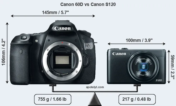 The physical size and weight of the Canon 60D and the Canon S120 are illustrated in the side-by-side display below. The two cameras are presented according to their relative size. Three consecutive perspectives from the front, the top, and the back are available. All width, height and depth dimensions are rounded to the nearest millimeter.