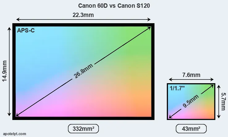 Of the two cameras under consideration, the Canon 60D features an APS-C sensor and the Canon S120 a 1/1.7-inch sensor. The sensor area in the S120 is 87 percent smaller. As a result of these sensor size differences, the cameras have a format factor of, respectively, 1.6 and 4.5. The sensor in the 60D has a native 3:2 aspect ratio, while the one in the S120 offers a 4:3 aspect.