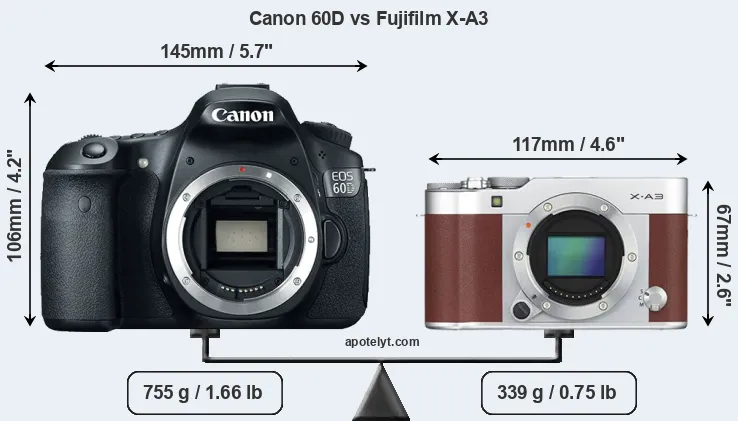 The above size and weight comparisons are to some extent incomplete since they do not consider the interchangeable lenses that both of these cameras require. Both cameras have similarly sized sensors, but DSLRs have a larger flange-to-focal plane distance than mirrorless cameras, which imposes contraints on the optical engineering process and generally leads to bigger and heavier lenses. You can compare the optics available for the two cameras in the Canon EF Lens Catalog (60D) and the Fujinon X Lens Catalog (X-A3). Mirrorless cameras, such as the X-A3, have moreover the advantage that they can use many lenses from other systems via adapters, as they have a relatively short flange to focal plane distance.