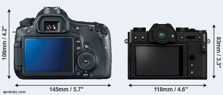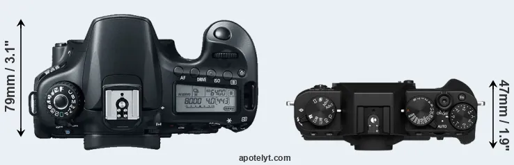 The physical size and weight of the Canon 60D and the Fujifilm X-T30 II are illustrated in the side-by-side display below. The two cameras are presented according to their relative size. Three consecutive perspectives from the front, the top, and the back are available. All width, height and depth dimensions are rounded to the nearest millimeter.