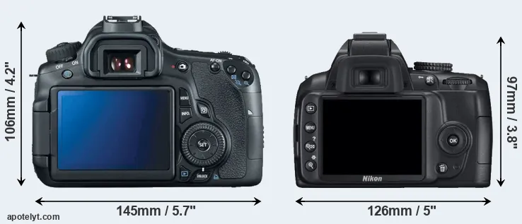 The side-by-side display below illustrates the physical size and weight of the Canon 60D and the Nikon D3000. The two cameras are presented according to their relative size. Three consecutive perspectives from the front, the top, and the back are available. All width, height and depth dimensions are rounded to the nearest millimeter.