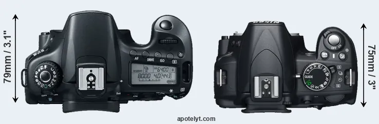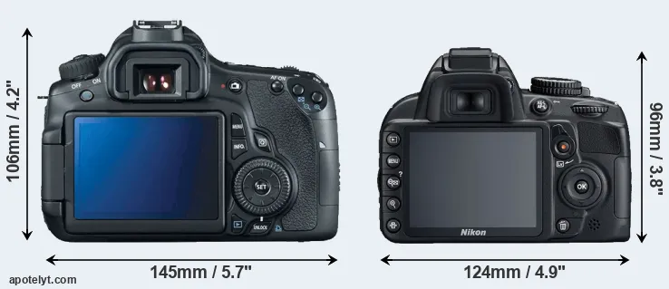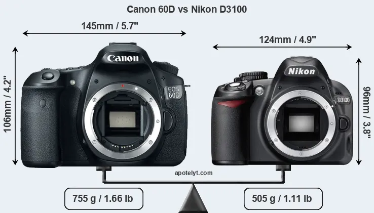 The physical size and weight of the Canon 60D and the Nikon D3100 are illustrated in the side-by-side display below. The two cameras are presented according to their relative size. Three consecutive perspectives from the front, the top, and the back are available. All size dimensions are rounded to the nearest millimeter.