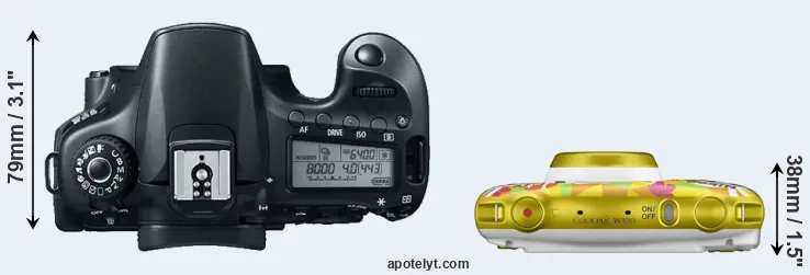 An illustration of the physical size and weight of the Canon 60D and the Nikon W150 is provided in the side-by-side display below. The two cameras are presented according to their relative size. Three consecutive views from the front, the top, and the rear side are shown. All width, height and depth dimensions are rounded to the nearest millimeter.