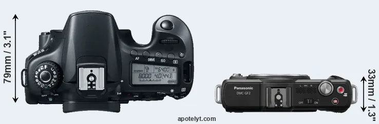 The physical size and weight of the Canon 60D and the Panasonic GF2 are illustrated in the side-by-side display below. The two cameras are presented according to their relative size. Three successive views from the front, the top, and the rear are shown. All size dimensions are rounded to the nearest millimeter.