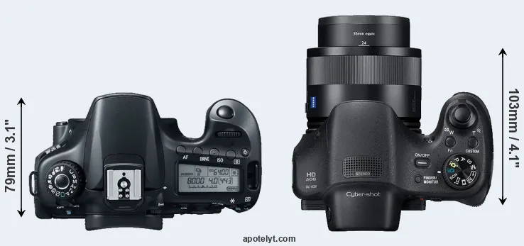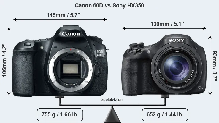 The side-by-side display below illustrates the physical size and weight of the Canon 60D and the Sony HX350. The two cameras are presented according to their relative size. Three consecutive perspectives from the front, the top, and the back are available. All size dimensions are rounded to the nearest millimeter.