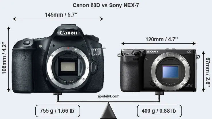 The above size and weight comparisons are to some extent incomplete since they do not consider the interchangeable lenses that both of these cameras require. Both cameras have similarly sized sensors, but DSLRs have a larger flange-to-focal plane distance than mirrorless cameras, which imposes contraints on the optical engineering process and generally leads to bigger and heavier lenses. You can compare the optics available for the two cameras in the Canon EF Lens Catalog (60D) and the Sony E-Mount Lens Catalog (NEX-7). Mirrorless cameras, such as the NEX-7, have moreover the advantage that they can use many lenses from other systems via adapters, as they have a relatively short flange to focal plane distance.