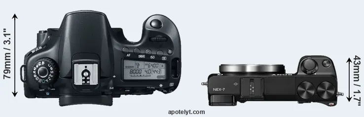 The side-by-side display below illustrates the physical size and weight of the Canon 60D and the Sony NEX-7. The two cameras are presented according to their relative size. Three consecutive views from the front, the top, and the rear side are shown. All size dimensions are rounded to the nearest millimeter.