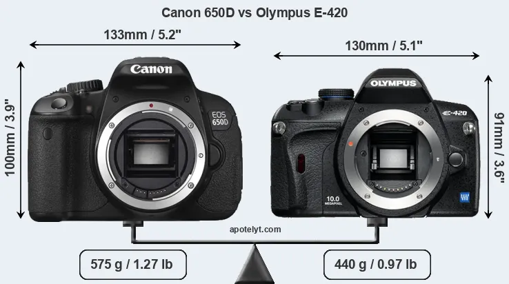 An illustration of the physical size and weight of the Canon 650D and the Olympus E-420 is provided in the side-by-side display below. The two cameras are presented according to their relative size. Three successive views from the front, the top, and the rear are shown. All size dimensions are rounded to the nearest millimeter.