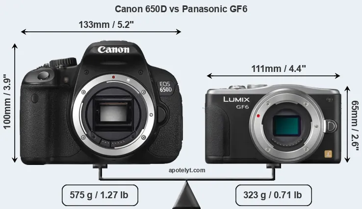 The side-by-side display below illustrates the physical size and weight of the Canon 650D and the Panasonic GF6. The two cameras are presented according to their relative size. Three successive views from the front, the top, and the rear are shown. All size dimensions are rounded to the nearest millimeter.