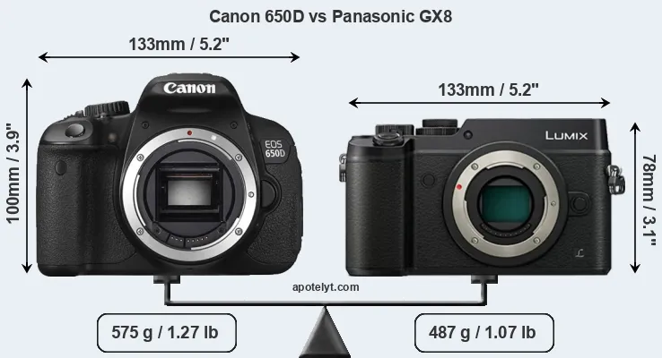 An illustration of the physical size and weight of the Canon 650D and the Panasonic GX8 is provided in the side-by-side display below. The two cameras are presented according to their relative size. Three successive views from the front, the top, and the rear are shown. All width, height and depth measures are rounded to the nearest millimeter.