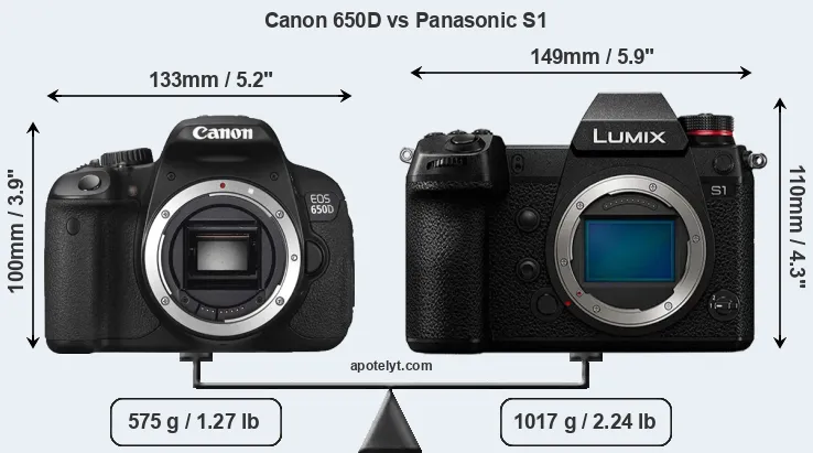 If the front view area (width x height) of the cameras is taken as an aggregate measure of their size, the Panasonic S1 is notably larger (23 percent) than the Canon 650D. Moreover, the S1 is substantially heavier (77 percent) than the 650D. It is noteworthy in this context that the S1 is splash and dust-proof, while the 650D does not feature any corresponding weather-sealing.