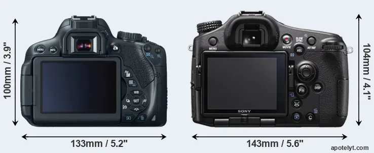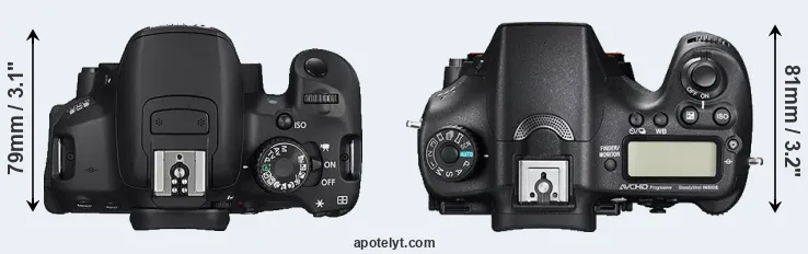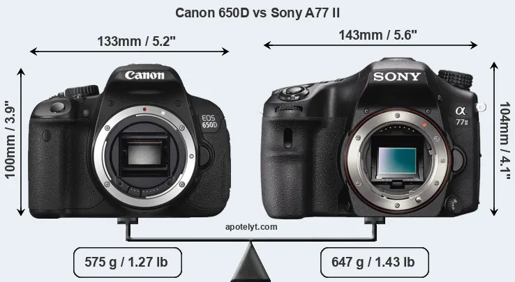 The side-by-side display below illustrates the physical size and weight of the Canon 650D and the Sony A77 II. The two cameras are presented according to their relative size. Three consecutive perspectives from the front, the top, and the back are available. All width, height and depth measures are rounded to the nearest millimeter.